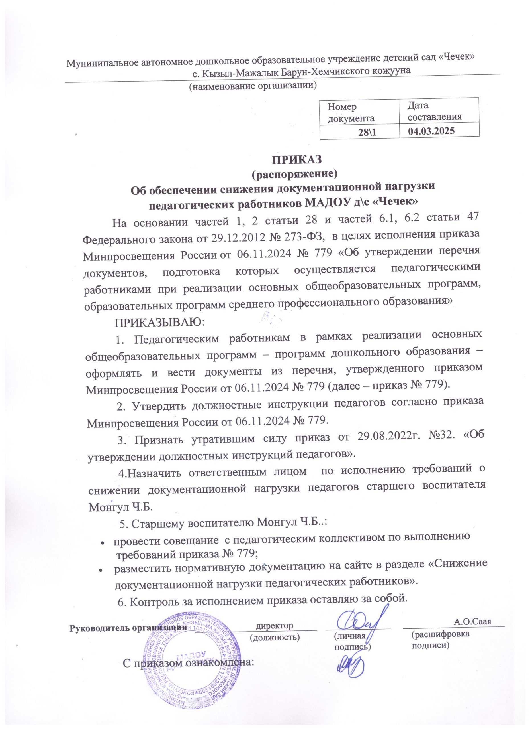 Без рубрики Снижение документационной нагрузки педагогических работников 01.04.2025 / Prikaz_Ministerstva_Prosvescheniya_779_ot_06.11.2024g.Скачать Приказ-об-обеспечении-снижения-документационной-нагрузкиСкачать Приказ-об-изменении-НПА-по-315-ФЗСкачать Должностная-инструкция-воспитателя-ДОУ-01.03.2025гСкачать Доп-соглашение-01.03.2025гСкачать Приказ-об-организации-постов-первой-помощиСкачать Приказ-об-изменении-НПА-по-315-ФЗ-1Скачать